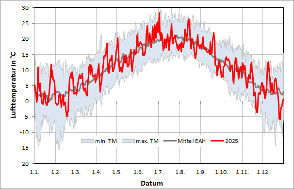 Mit einem Jahresmittel von 10,9 °C teilt sich 2025 mit 2007 den 10. Platz auf der Liste der warmen Jahre seit Beginn der Messungen an der EAH.
